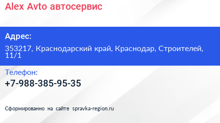 Alex Avto, автосервис по адресу 353217, Краснодарский край, Краснодар, Строителей, 11/1 в дальнейшем Организация, размещена в следующих категориях: