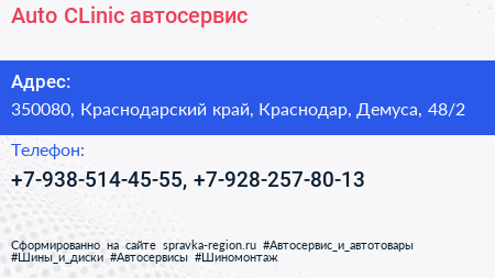 Auto-CLinic, автосервис по адресу 350080, Краснодарский край, Краснодар, Демуса, 48/2 в дальнейшем Организация, размещена в следующих категориях: