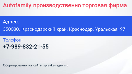 Autofamily, производственно-торговая фирма по адресу 350080, Краснодарский край, Краснодар, Уральская, 97 в дальнейшем Организация, размещена в следующих категориях:
