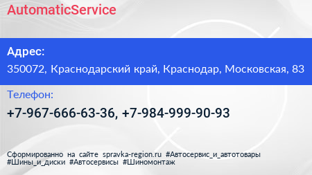 AutomaticService по адресу 350072, Краснодарский край, Краснодар, Московская, 83 в дальнейшем Организация, размещена в следующих категориях: