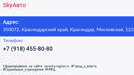SkyАвто по адресу 350072, Краснодарский край, Краснодар, Московская, 123 в дальнейшем Организация, размещена в следующих категориях:
