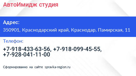 АвтоИмидж, студия по адресу 350901, Краснодарский край, Краснодар, Памирская, 11 в дальнейшем Организация, размещена в следующих категориях: