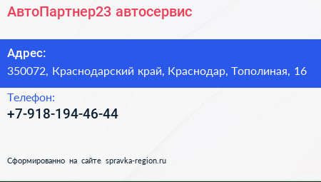 АвтоПартнер23, автосервис по адресу 350072, Краснодарский край, Краснодар, Тополиная, 16 в дальнейшем Организация, размещена в следующих категориях: