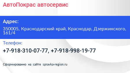 АвтоПокрас, автосервис по адресу 350005, Краснодарский край, Краснодар, Дзержинского, 161/4 в дальнейшем Организация, размещена в следующих категориях: