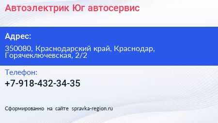 Автоэлектрик-Юг, автосервис по адресу 350080, Краснодарский край, Краснодар, Горячеключевская, 2/2 в дальнейшем Организация, размещена в следующих категориях: