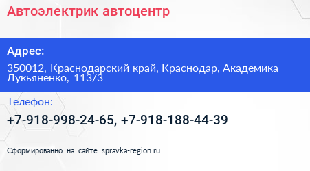 Автоэлектрик, автоцентр по адресу 350012, Краснодарский край, Краснодар, Академика Лукьяненко, 113/3 в дальнейшем Организация, размещена в следующих категориях: