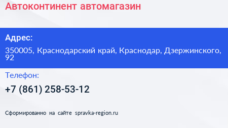 Автоконтинент, автомагазин по адресу 350005, Краснодарский край, Краснодар, Дзержинского, 92 в дальнейшем Организация, размещена в следующих категориях: