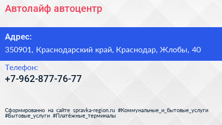 Автолайф, автоцентр по адресу 350901, Краснодарский край, Краснодар, Жлобы, 40 в дальнейшем Организация, размещена в следующих категориях: