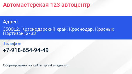 Автомастерская 123, автоцентр по адресу 350012, Краснодарский край, Краснодар, Красных Партизан, 2/33 в дальнейшем Организация, размещена в следующих категориях: