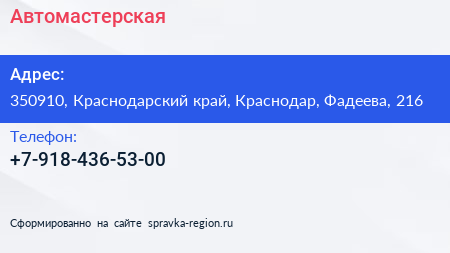 Автомастерская по адресу 350910, Краснодарский край, Краснодар, Фадеева, 216 в дальнейшем Организация, размещена в следующих категориях: