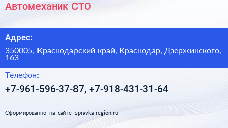 Автомеханик, СТО по адресу 350005, Краснодарский край, Краснодар, Дзержинского, 163 в дальнейшем Организация, размещена в следующих категориях: