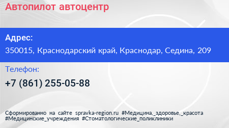 Автопилот, автоцентр по адресу 350015, Краснодарский край, Краснодар, Седина, 209 в дальнейшем Организация, размещена в следующих категориях:
