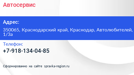 Автосервис по адресу 350065, Краснодарский край, Краснодар, Автолюбителей, 1/3а в дальнейшем Организация, размещена в следующих категориях:
