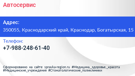 Автосервис по адресу 350055, Краснодарский край, Краснодар, Богатырская, 15 в дальнейшем Организация, размещена в следующих категориях: