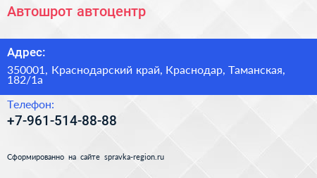 Автошрот, автоцентр по адресу 350001, Краснодарский край, Краснодар, Таманская, 182/1а в дальнейшем Организация, размещена в следующих категориях: