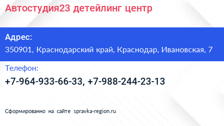 Автостудия23, детейлинг-центр по адресу 350901, Краснодарский край, Краснодар, Ивановская, 7 в дальнейшем Организация, размещена в следующих категориях: