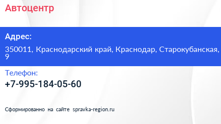 Автоцентр по адресу 350011, Краснодарский край, Краснодар, Старокубанская, 9 в дальнейшем Организация, размещена в следующих категориях: