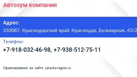 Автозум, компания по адресу 350087, Краснодарский край, Краснодар, Бульварная, 43/2 в дальнейшем Организация, размещена в следующих категориях: