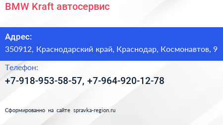BMW-Kraft, автосервис по адресу 350912, Краснодарский край, Краснодар, Космонавтов, 9 в дальнейшем Организация, размещена в следующих категориях: