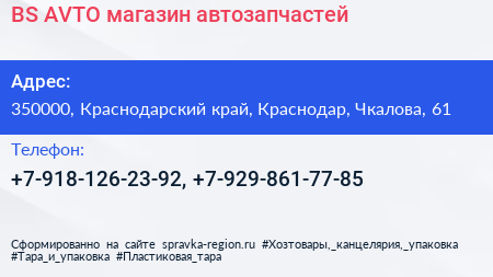 BS AVTO, магазин автозапчастей по адресу 350000, Краснодарский край, Краснодар, Чкалова, 61 в дальнейшем Организация, размещена в следующих категориях: