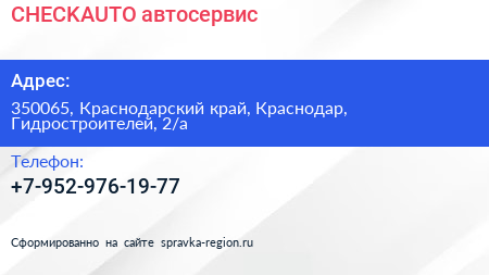 CHECKAUTO, автосервис по адресу 350065, Краснодарский край, Краснодар, Гидростроителей, 2/а в дальнейшем Организация, размещена в следующих категориях: