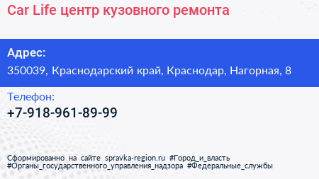 Car Life, центр кузовного ремонта по адресу 350039, Краснодарский край, Краснодар, Нагорная, 8 в дальнейшем Организация, размещена в следующих категориях: