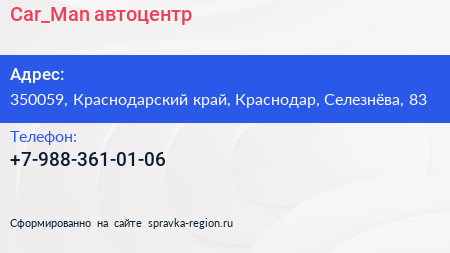 Car_Man, автоцентр по адресу 350059, Краснодарский край, Краснодар, Селезнёва, 83 в дальнейшем Организация, размещена в следующих категориях: