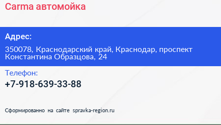 Carma, автомойка по адресу 350078, Краснодарский край, Краснодар, проспект Константина Образцова, 24 в дальнейшем Организация, размещена в следующих категориях: