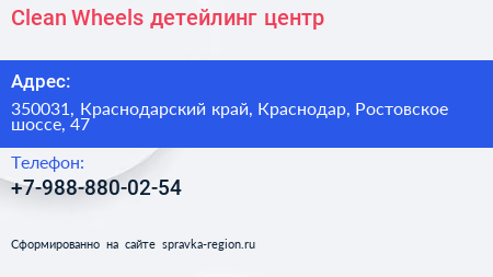 Clean Wheels, детейлинг-центр по адресу 350031, Краснодарский край, Краснодар, Ростовское шоссе, 47 в дальнейшем Организация, размещена в следующих категориях: