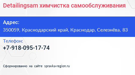 Detailingsam, химчистка самообслуживания по адресу 350059, Краснодарский край, Краснодар, Селезнёва, 83 в дальнейшем Организация, размещена в следующих категориях: