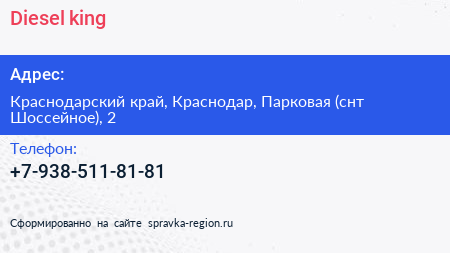 Diesel king по адресу Краснодарский край, Краснодар, Парковая (снт Шоссейное), 2 в дальнейшем Организация, размещена в следующих категориях: