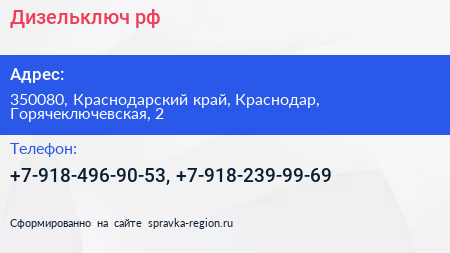 Дизельключ.рф по адресу 350080, Краснодарский край, Краснодар, Горячеключевская, 2 в дальнейшем Организация, размещена в следующих категориях: