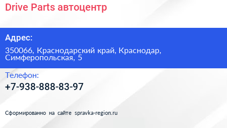 Drive Parts, автоцентр по адресу 350066, Краснодарский край, Краснодар, Симферопольская, 5 в дальнейшем Организация, размещена в следующих категориях: