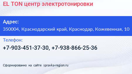 EL-TON, центр электротонировки по адресу 350004, Краснодарский край, Краснодар, Кожевенная, 10 в дальнейшем Организация, размещена в следующих категориях: