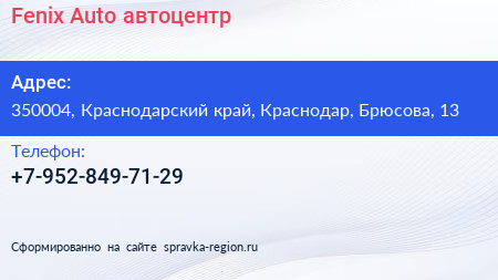 Fenix Auto, автоцентр по адресу 350004, Краснодарский край, Краснодар, Брюсова, 13 в дальнейшем Организация, размещена в следующих категориях: