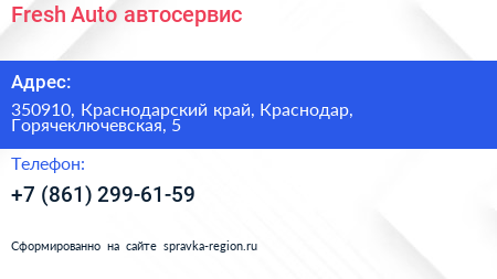 Fresh Auto, автосервис по адресу 350910, Краснодарский край, Краснодар, Горячеключевская, 5 в дальнейшем Организация, размещена в следующих категориях: