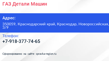 ГАЗ Детали Машин по адресу 350059, Краснодарский край, Краснодар, Новороссийская, 3/9 в дальнейшем Организация, размещена в следующих категориях: