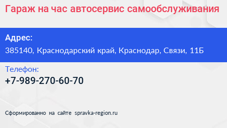 Гараж на час, автосервис самообслуживания по адресу 385140, Краснодарский край, Краснодар, Связи, 11Б в дальнейшем Организация, размещена в следующих категориях: