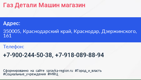 Газ Детали Машин, магазин по адресу 350005, Краснодарский край, Краснодар, Дзержинского, 161 в дальнейшем Организация, размещена в следующих категориях: