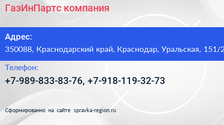 ГазИнПартс, компания по адресу 350088, Краснодарский край, Краснодар, Уральская, 151/2 в дальнейшем Организация, размещена в следующих категориях: