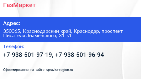 ГазМаркет по адресу 350065, Краснодарский край, Краснодар, проспект Писателя Знаменского, 31 к1 в дальнейшем Организация, размещена в следующих категориях: