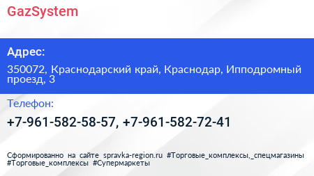 GazSystem по адресу 350072, Краснодарский край, Краснодар, Ипподромный проезд, 3 в дальнейшем Организация, размещена в следующих категориях: