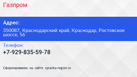 Газпром по адресу 350087, Краснодарский край, Краснодар, Ростовское шоссе, 56 в дальнейшем Организация, размещена в следующих категориях: