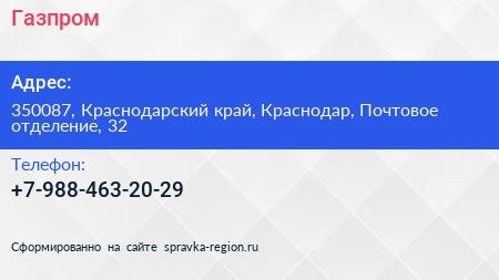 Газпром по адресу 350087, Краснодарский край, Краснодар, Почтовое отделение, 32 в дальнейшем Организация, размещена в следующих категориях: