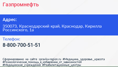 Газпромнефть по адресу 350073, Краснодарский край, Краснодар, Кирилла Россинского, 1а в дальнейшем Организация, размещена в следующих категориях: