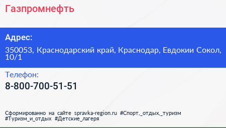 Газпромнефть по адресу 350053, Краснодарский край, Краснодар, Евдокии Сокол, 10/1 в дальнейшем Организация, размещена в следующих категориях: