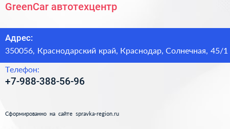 GreenCar, автотехцентр по адресу 350056, Краснодарский край, Краснодар, Солнечная, 45/1 в дальнейшем Организация, размещена в следующих категориях: