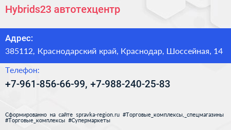Hybrids23, автотехцентр по адресу 385112, Краснодарский край, Краснодар, Шоссейная, 14 в дальнейшем Организация, размещена в следующих категориях: