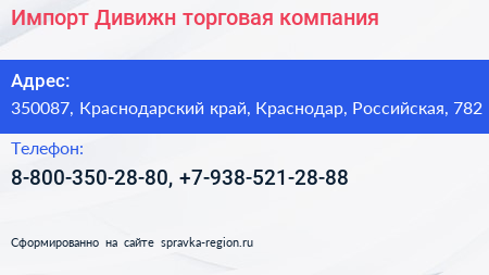Импорт Дивижн, торговая компания по адресу 350087, Краснодарский край, Краснодар, Российская, 782 в дальнейшем Организация, размещена в следующих категориях: