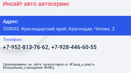 Инсайт авто, автосервис по адресу 350033, Краснодарский край, Краснодар, Чехова, 2 в дальнейшем Организация, размещена в следующих категориях: